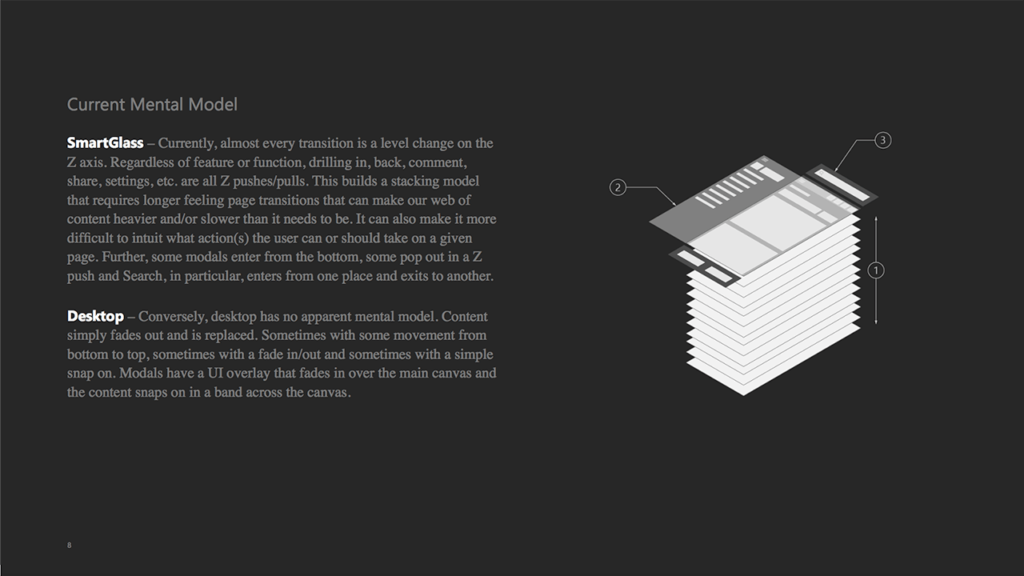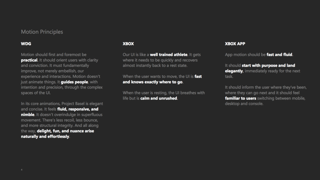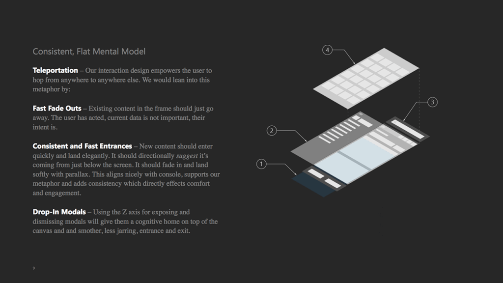 These early Fluent experiments are looking for opportunity in depth and interaction with the platform. In the first example, instead of just clicking A or the D-pad to jump to the data, can the thumb stick peek into the content behind the card before revealing it? Is “playing the platform” fun or just keeping me from my game?